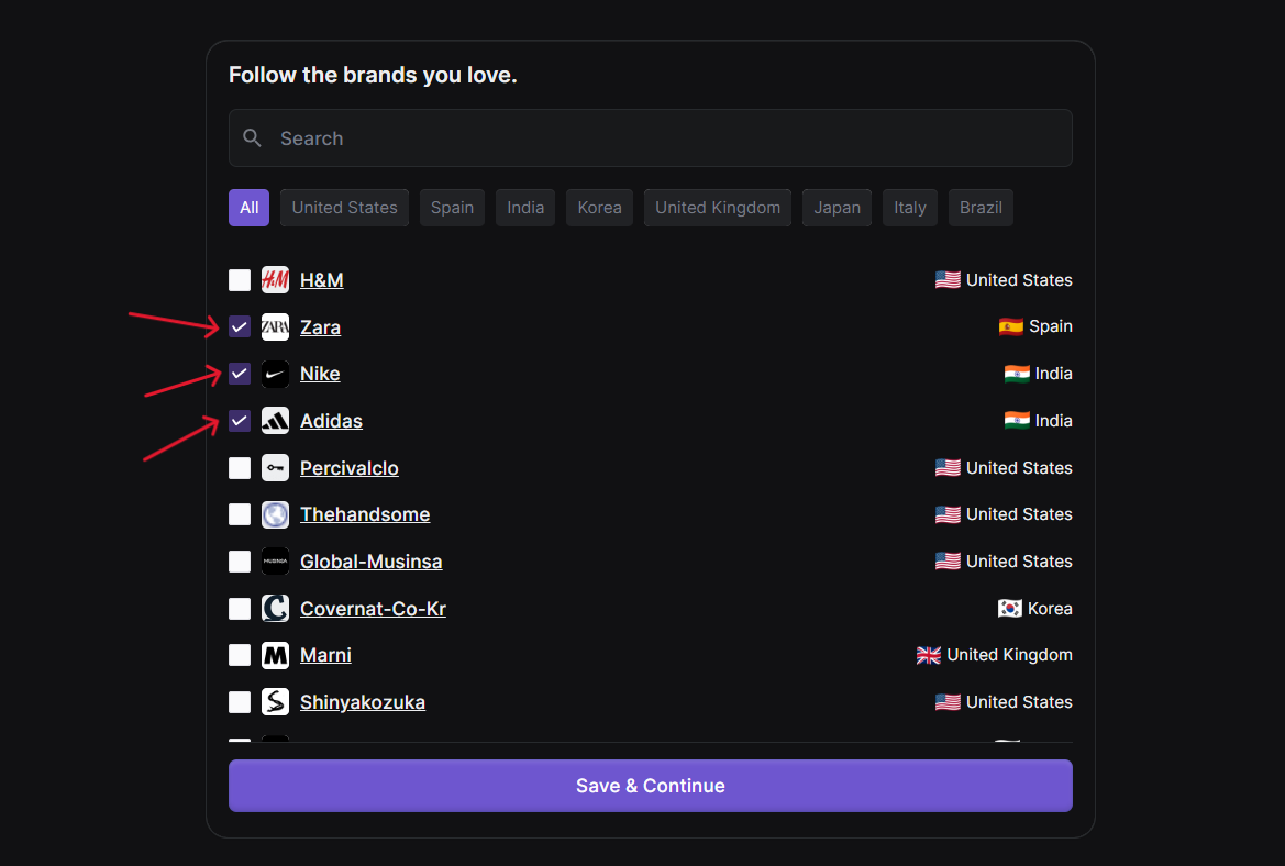 Select up to 3 brands to follow — this helps personalize your inspiration stream.