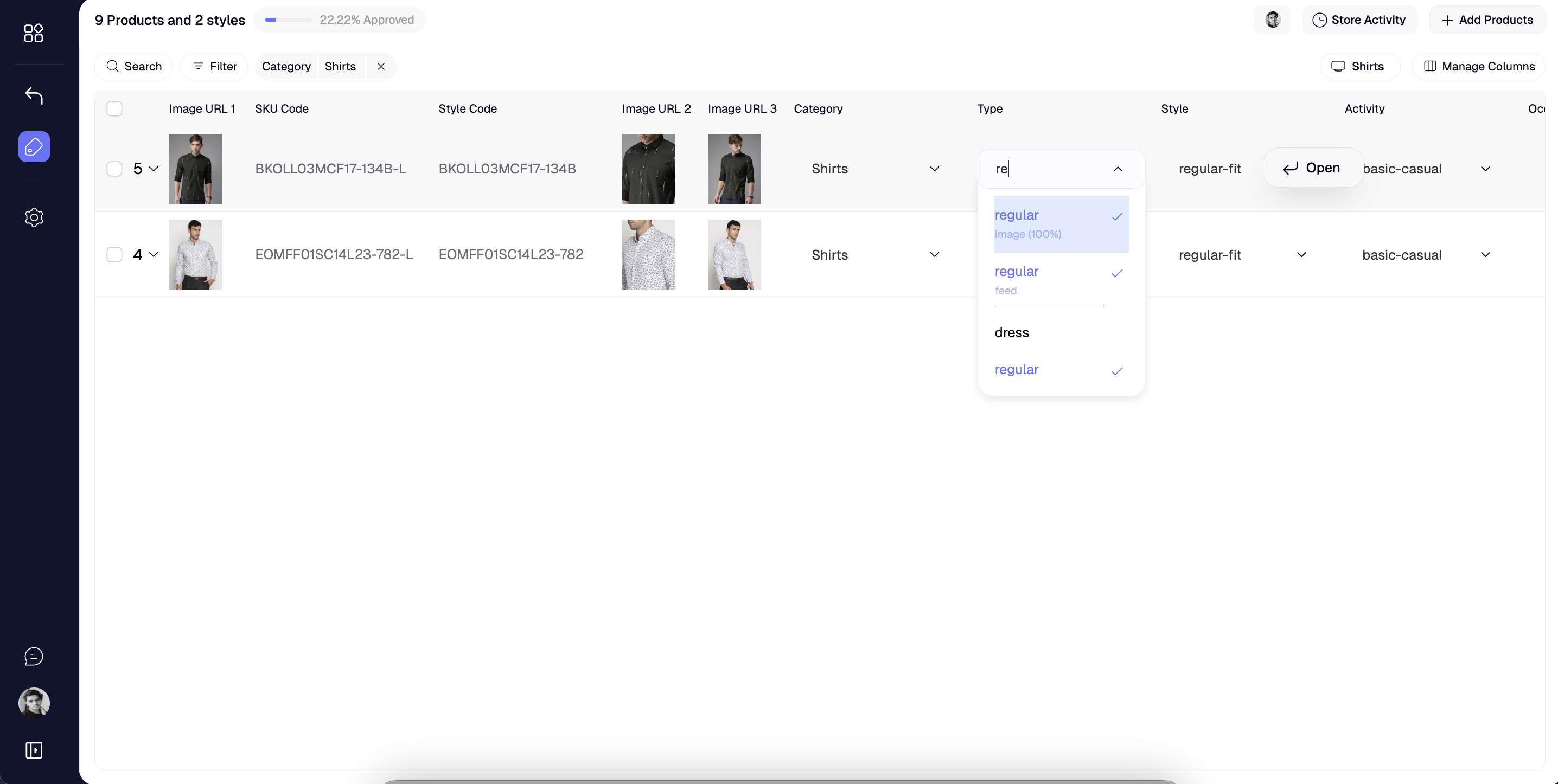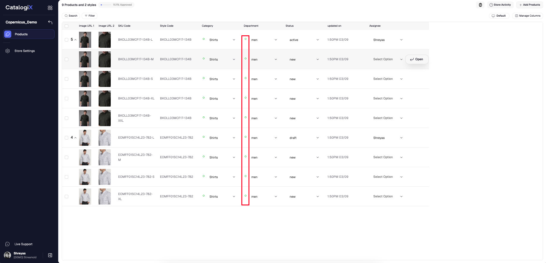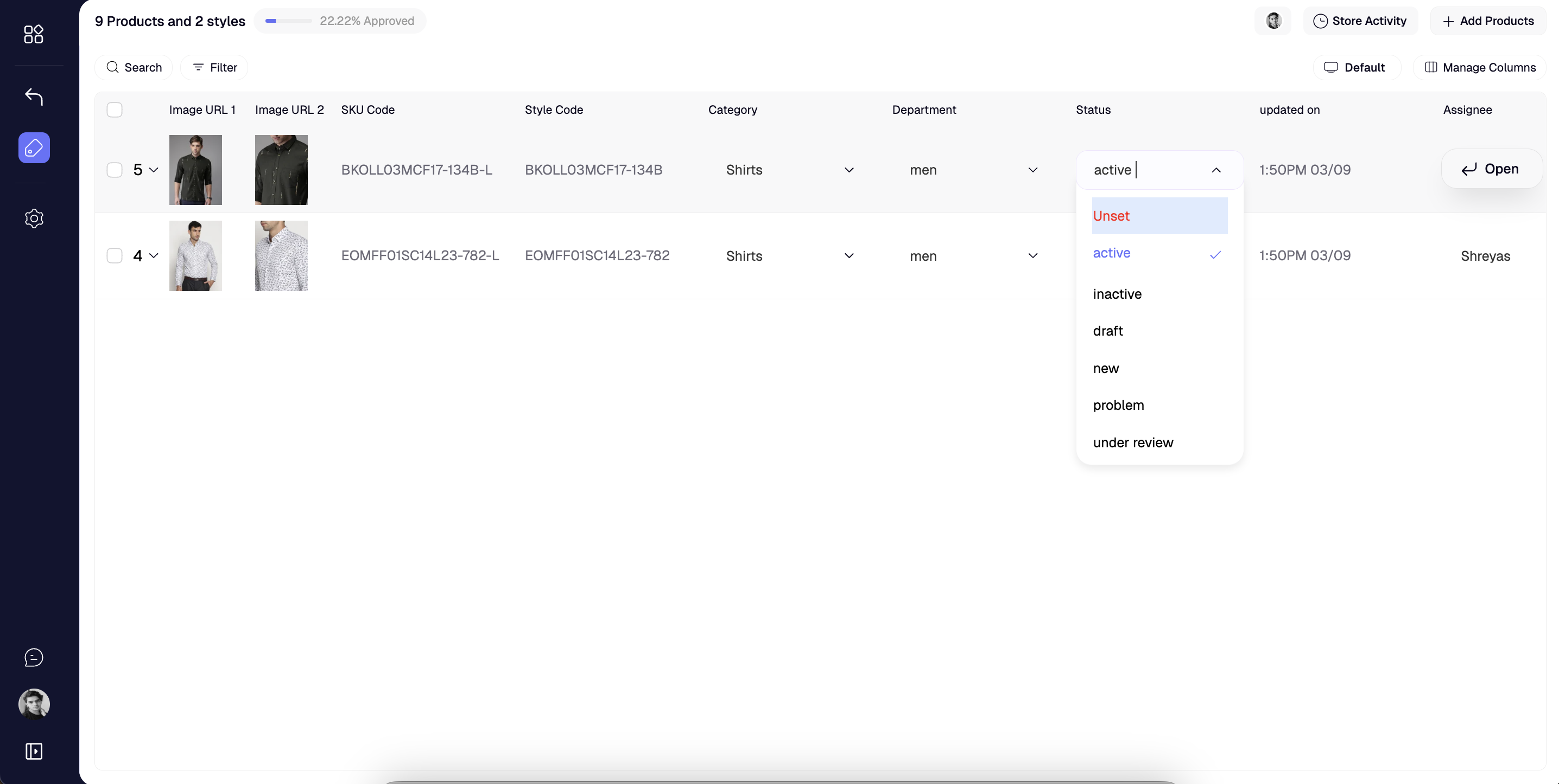 In case you want to make changes to any attirbute, Click any attribute cell to open the dropdown selector and choose a new value. Search inside the dropdown to find the right option quickly.Set Product Status
