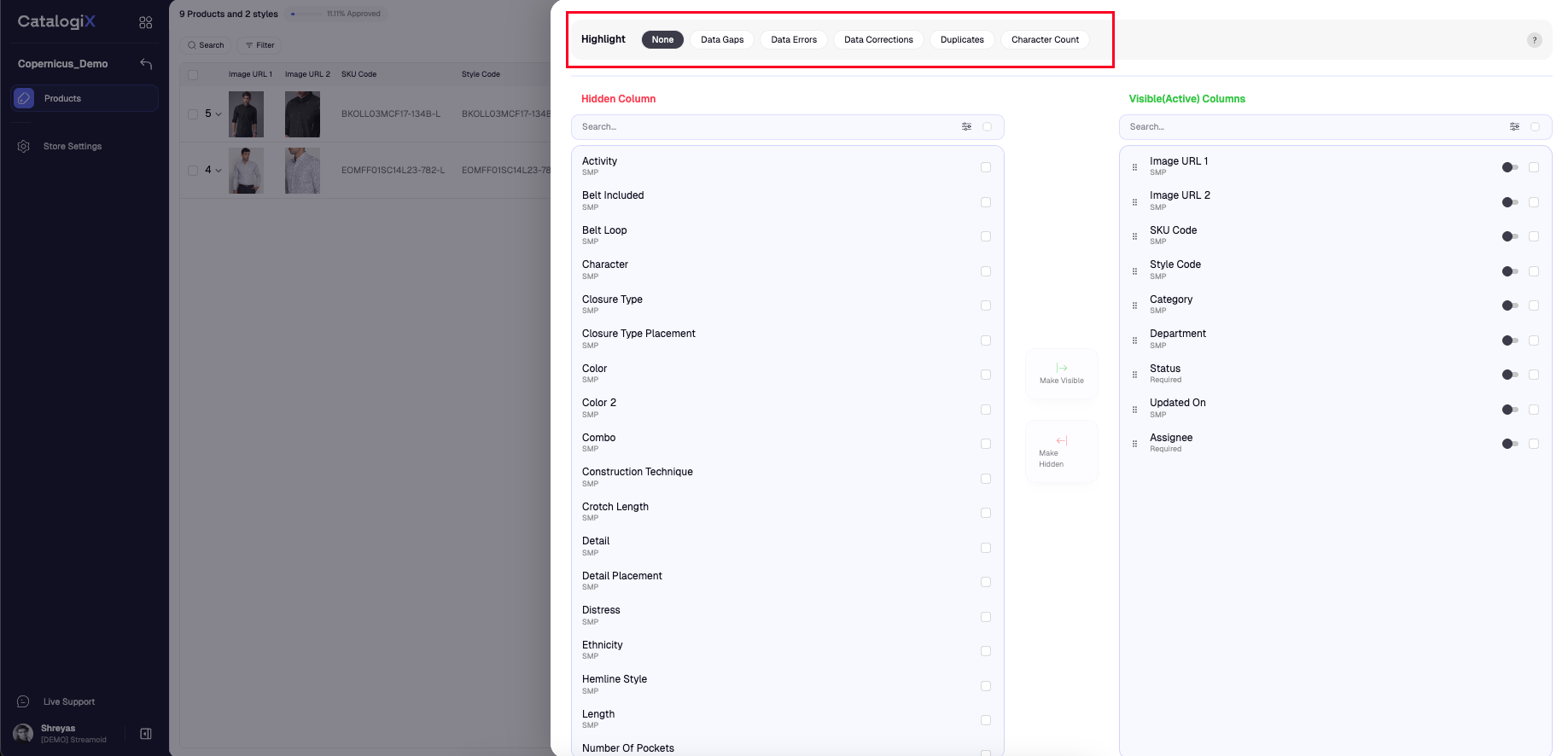 Use highlights to quickly spot data gaps, errors, corrections, duplicates, and character counts across the PLP.Enable Highlights