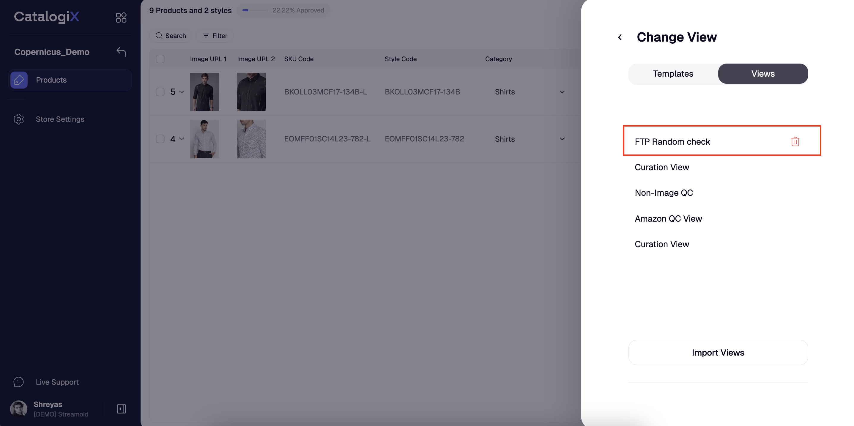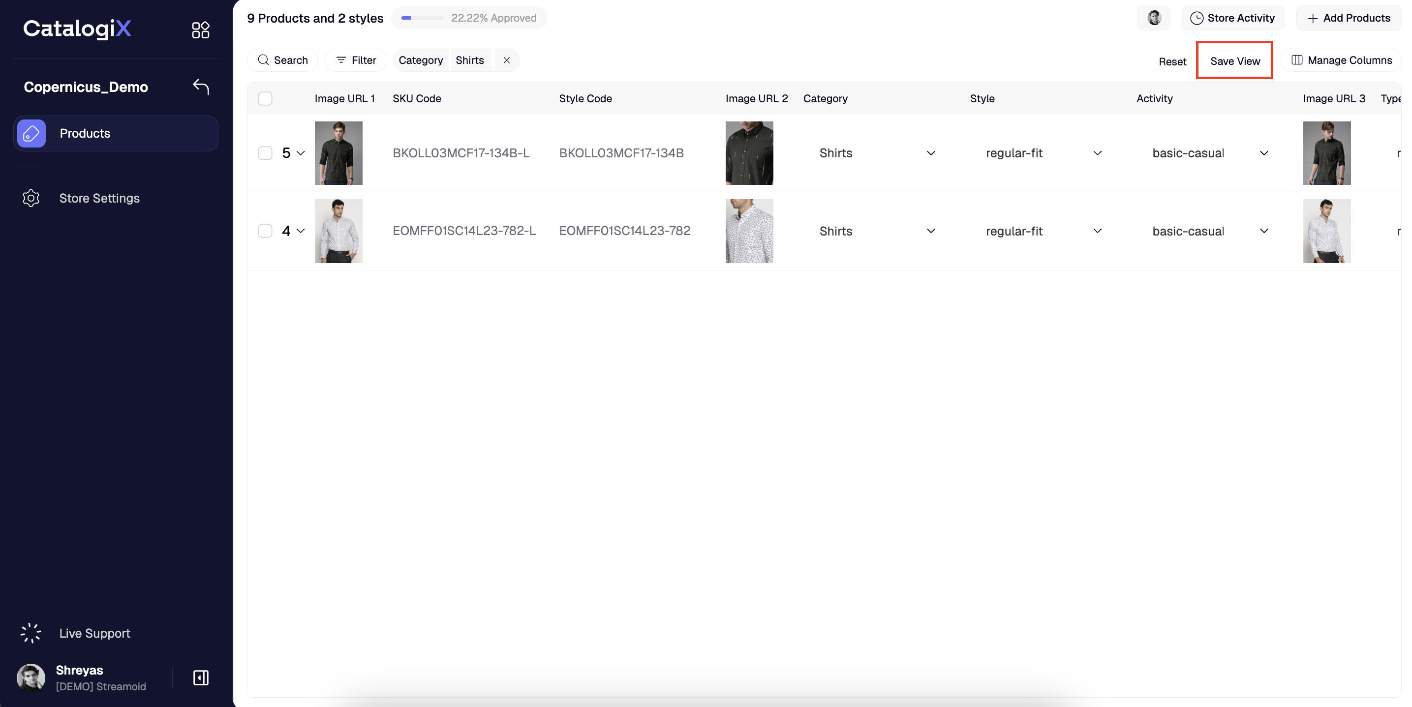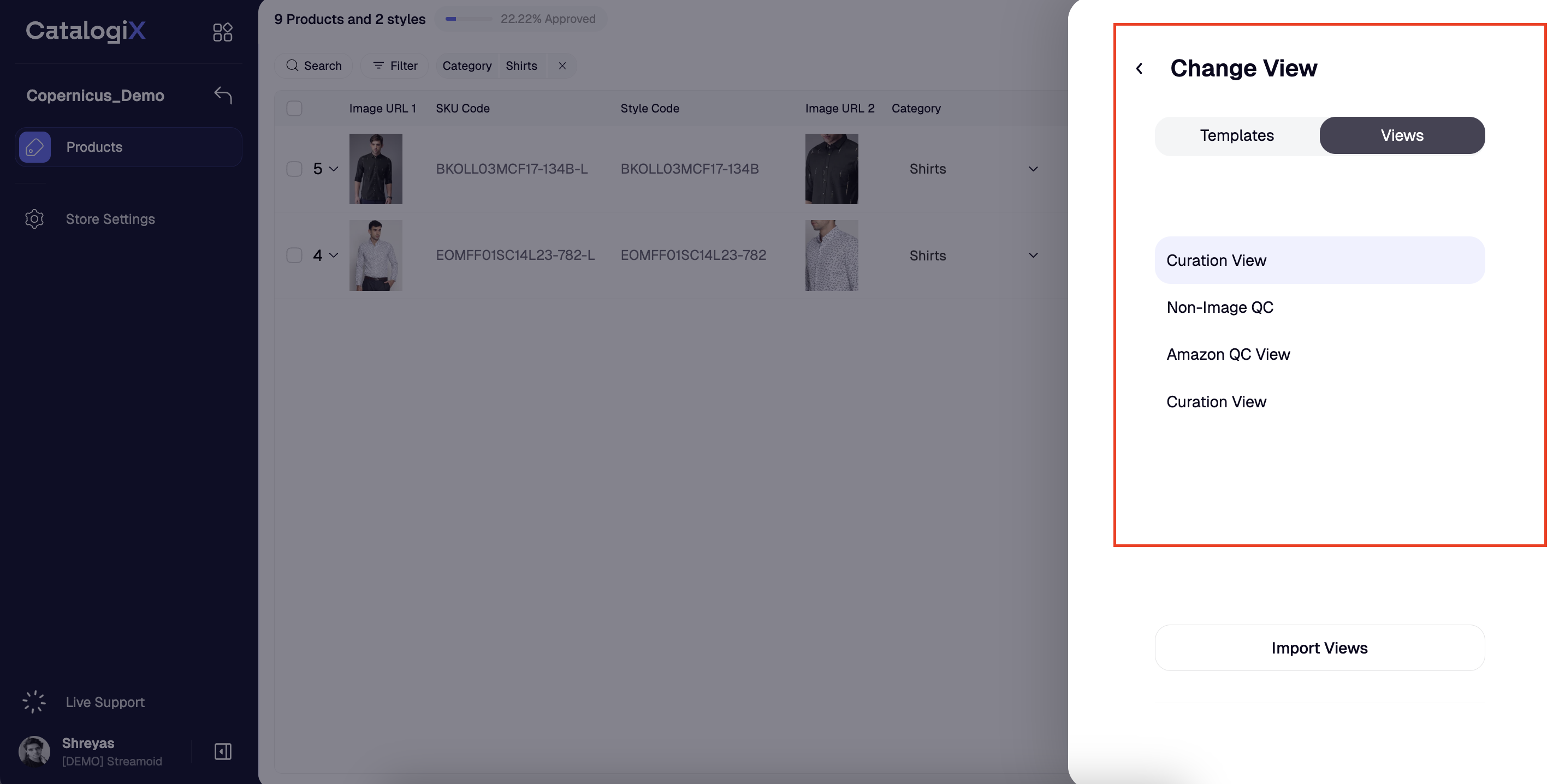 Once you have uploaded products to your store you can now start checking for data quality. To do so, you can switch your views based on category.A view is a specifc collection of columns/attributes that are actively visible to you on the PLP.